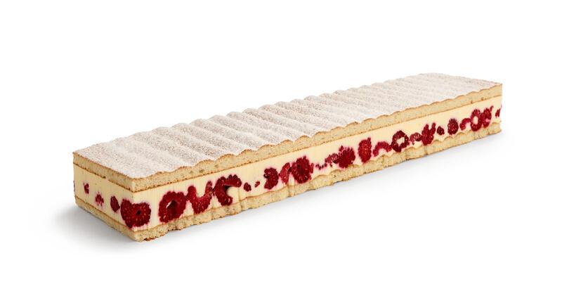 Whole raspberries in a soft vanilla cream mousse sit between two thick almond macaroon biscuits, dusted with powdered sugar. A truly elegant treat.
